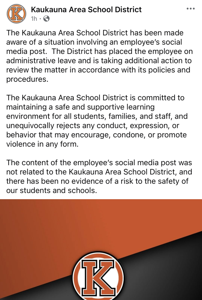 KAUKAUNA — The Kaukauna Area School District has placed a teacher on administrative leave while it investigates a social media post shared following a shooting outside the White House Correspondents Association dinner attended by President Donald Trump.
